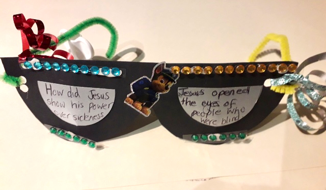 Action songs and kazoos helped the children to express how, ‘When we cry out, Jesus hears us’. A superb stash of crafting items such as: paper plates, crayons, glue, scissors, googly eyes and sticks were used to recreate the face of Bartimaeus and write captions on such as, ‘Cry out to Jesus!’ and ‘Blind Bartimaeus was healed!’ Decorated black-out glasses demonstrated very clearly what it was like to be physically blind and helped the children appreciate the kind of challenges Bartimaeus faced.